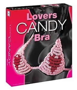 Słodka bielizna wykonana z cukierków. Cukierkowy różowy biustonosz z motywem serca idealny jako dodatek do miłosnych igraszek.