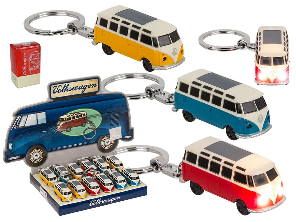 Breloczek w kształcie busa marki Volkswagen. Brelok posiada diody LED. Produkt dostępny w trzech kolorach. Wysyłamy jako mix wzorów.