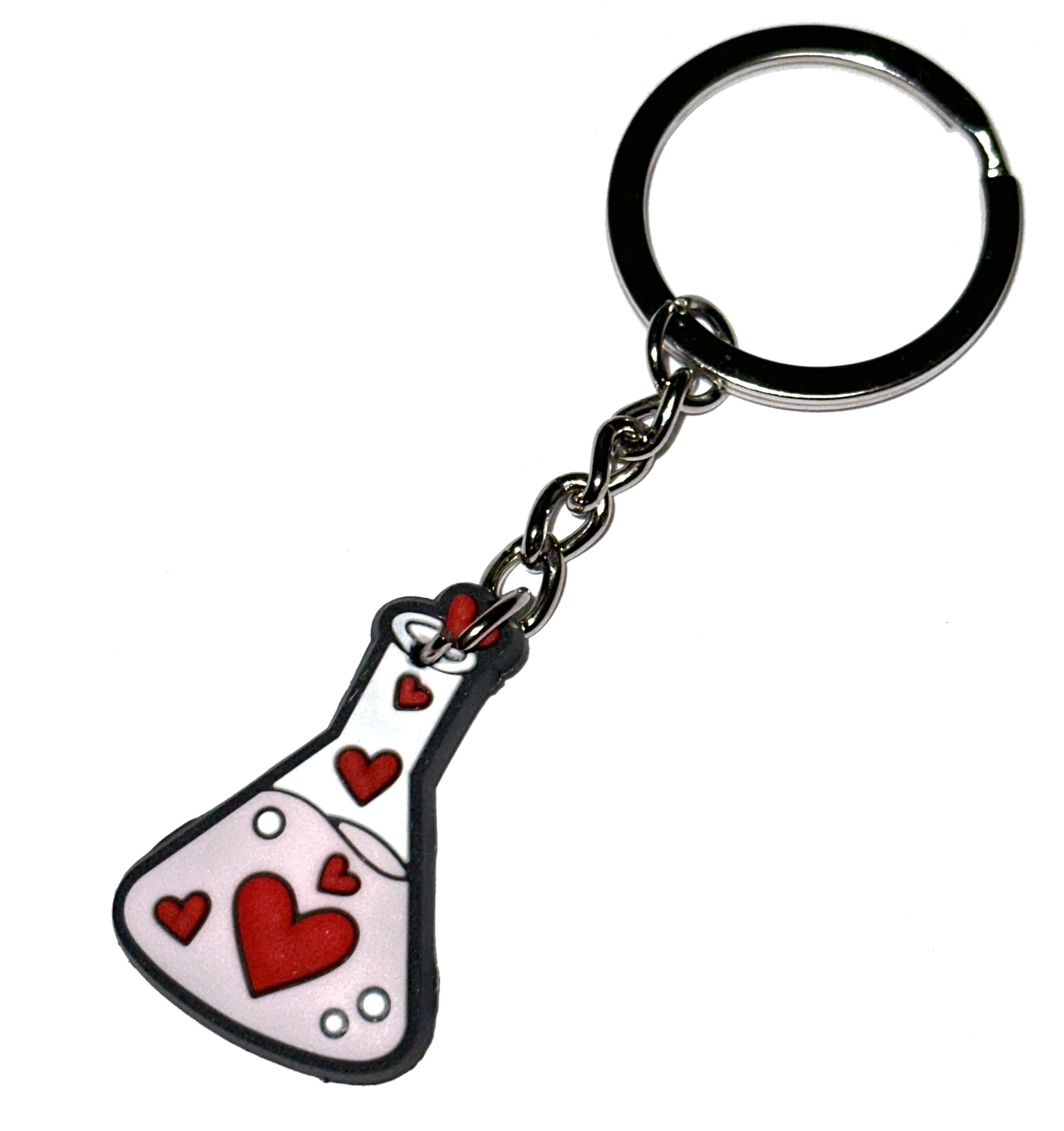 Brelok z motywem kolby laboratoryjnej i serc