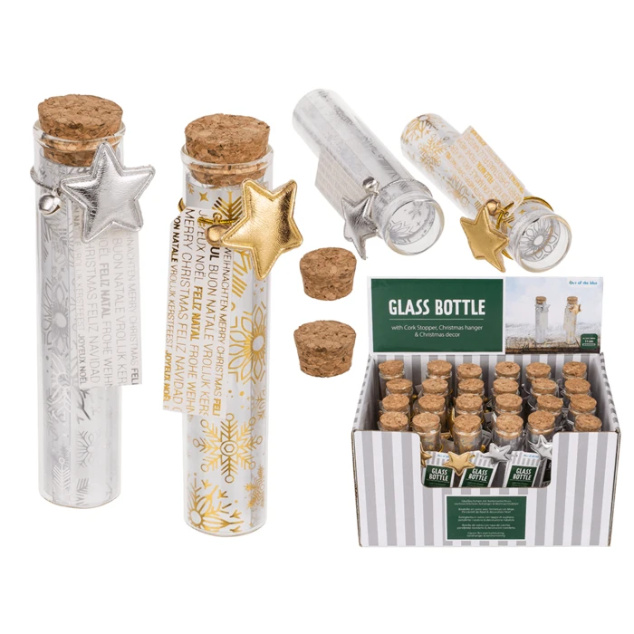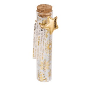 Wyjątkowy gadżet na Święta Bożego narodzenia. Butelka zamknięta korkiem, która będzie zawierać niespodziankę. Świetny sposób na umieszczenie karteczki z życzeniami. Buteleczka ozdobiona gwiazdką oraz ozdobną karteczką z dekorem. W środek można włożyć karteczkę z życzeniami, sekretnymi myślami, wyznaniem miłości i dołączyć ją do prezentu. Wyjątkowy gadżet świąteczny.