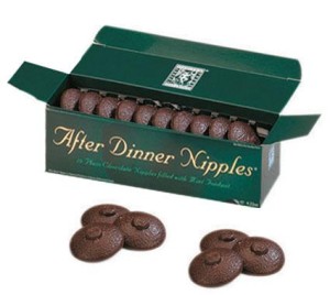 Czekoladowe bombonierki, w kształcie kobiecych walorów, wypełnione miętowym nadzieniem. Słodki prezent, lub dodatek na wieczór kawalerski.