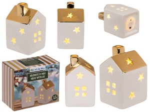 Ceramiczny domek świąteczny z LED to urocza dekoracja na święta. Wykonany z dolomitu, ten świąteczny domek jest podświetlany diodami LED, które dodają uroku i podkreślają motyw gwiazdek na jego powierzchni. Idealny sposób, aby wprowadzić świąteczny nastrój do Twojego domu.