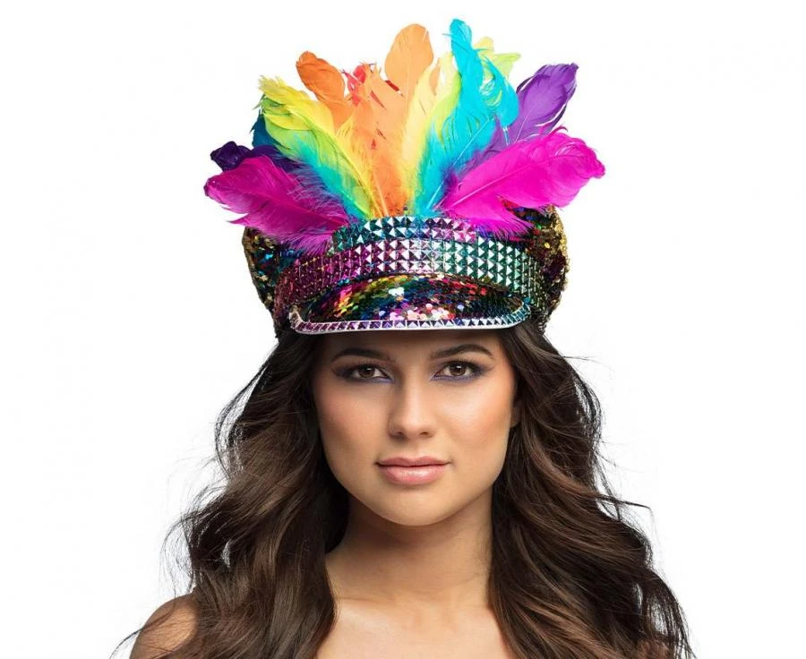 Kolorowa, rzucająca się w oczy czapka Rainbow z piórami to must-have na każdą imprezę, gdzie króluje dobra zabawa i wyjątkowy styl!