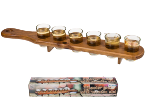 Zestaw zawiera 6 kieliszków oraz drewnianą deskę z uchwytem, co zapewnia komfortowe serwowanie trunków i nadaje imprezie niepowtarzalnego klimatu. Idealny wybór na urodziny, wieczory kawalerskie, panieńskie oraz domowe spotkania z przyjaciółmi.