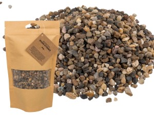 Kamienie rzeczne mają około 4-6 mm średnicy i są pakowane w papierową torbę o wadze 400 g. Torba posiada Kamienie rzeczne są pakowane w torebkę z papieru kraft, która charakteryzuje się wytrzymałością i odpornością na uszkodzenia mechaniczne. Torebka posiada okienko, które pozwala na łatwe podglądanie zawartości bez konieczności otwierania opakowania.