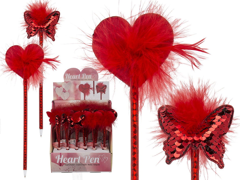 Czerwony długopis, na którego końcu znajduje się miękki kształt w postaci serduszka lub motylka, który wprawi w dobry nastrój każdego, a dzień będzie kolorowy i pogodny. Niebieski długopis obleczony dookoła czerwoną błyszczącą folią, na szczycie puszysty pompon z cekinowym serduszkiem lub motylkiem. Wysyłamy jako mix kolorów. Display zawiera 24 sztuki