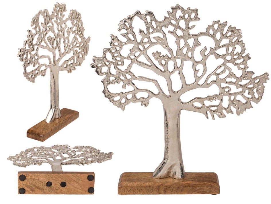 Doskonała ozdoba zarówno do salonu, jak i sypialni. Metalowe srebrne drzewo życia na drewnianej podstawie. Całość stylizowana w kierunku retro. Figurka może być wręczona jako urocza ozdoba do domu.
