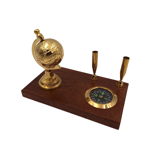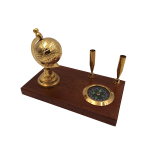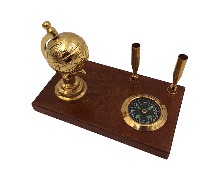 Wykonany z drewna i mosiądzu, zestaw wyróżnia się ponadczasowym stylem, doskonale komponując się z klasycznymi wnętrzami. Globus symbolizuje świat bez granic, kompas podkreśla determinację i dążenie do celu, a solidne uchwyty na długopisy pozwalają zachować porządek i organizację. Każdy element został zaprojektowany z myślą o estetyce i wygodzie użytkowania.