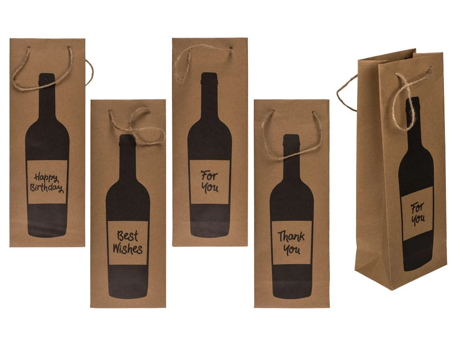 - Torba na butelkę wina z papieru craft z nadrukowaną butelką i życzeniami