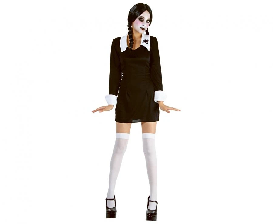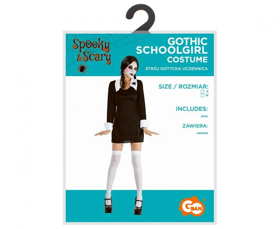 Zestaw „Gotycka uczennica” to wyjątkowy strój dla dorosłych, który łączy w sobie elegancję z mrocznym, alternatywnym stylem. Sukienka w rozmiarze S, utrzymana w klasycznej czerni z kontrastującymi białymi rękawami i kołnierzem, ma długość 80 cm, co zapewnia wygodę i swobodę ruchów podczas każdej imprezy tematycznej. Wykonana z wysokiej jakości poliestru, sukienka jest nie tylko estetyczna, lecz także trwała i komfortowa w noszeniu.