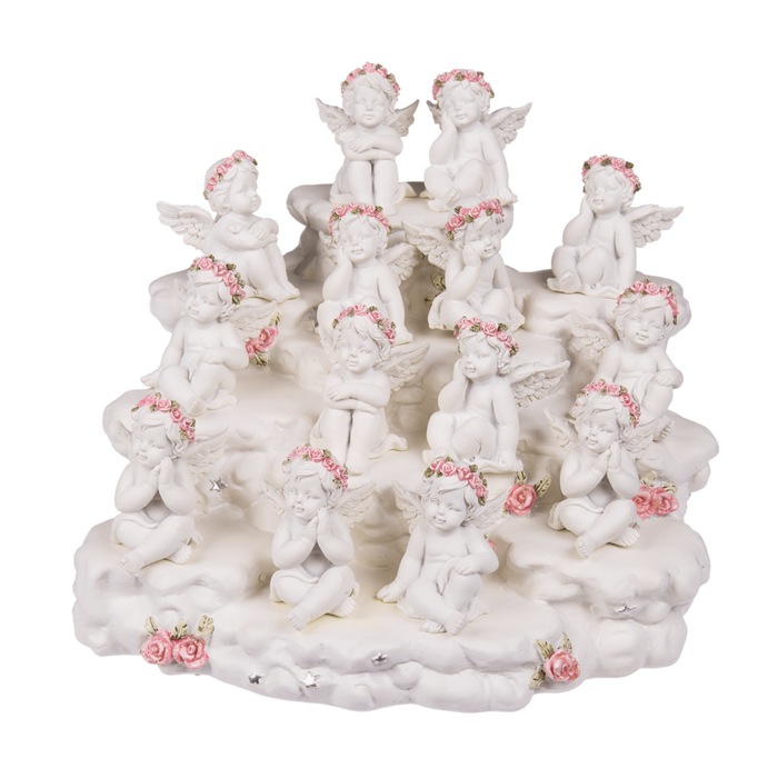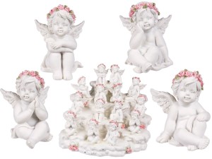 Każdy aniołek ma inny gest – od modlitewnego skupienia, przez zadumę, aż po radosny uśmiech. Dzięki temu każdy egzemplarz jest unikalny, a cała kolekcja tworzy harmonijną kompozycję pełną ciepła i symboliki. Różowy wianek z drobnych kwiatów dodaje figurce uroku i delikatności, czyniąc ją doskonałym prezentem lub elementem dekoracyjnym.