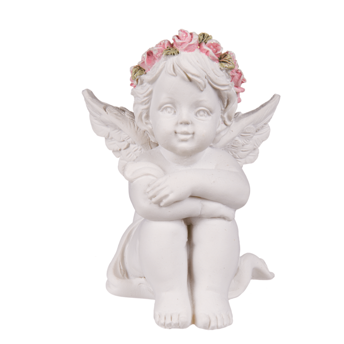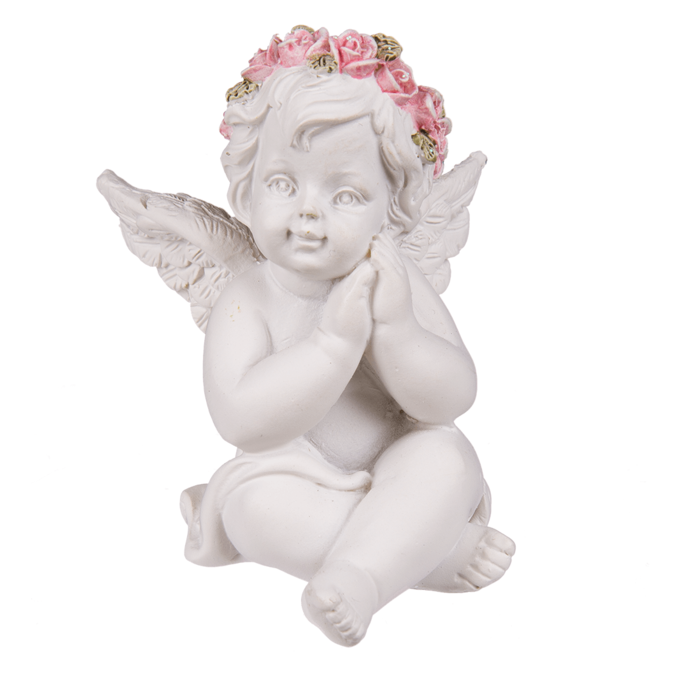 Urocza figurka aniołka z różowym wiankiem wprowadza do wnętrza spokój i harmonię. Idealna na prezent lub symboliczną ozdobę domu.