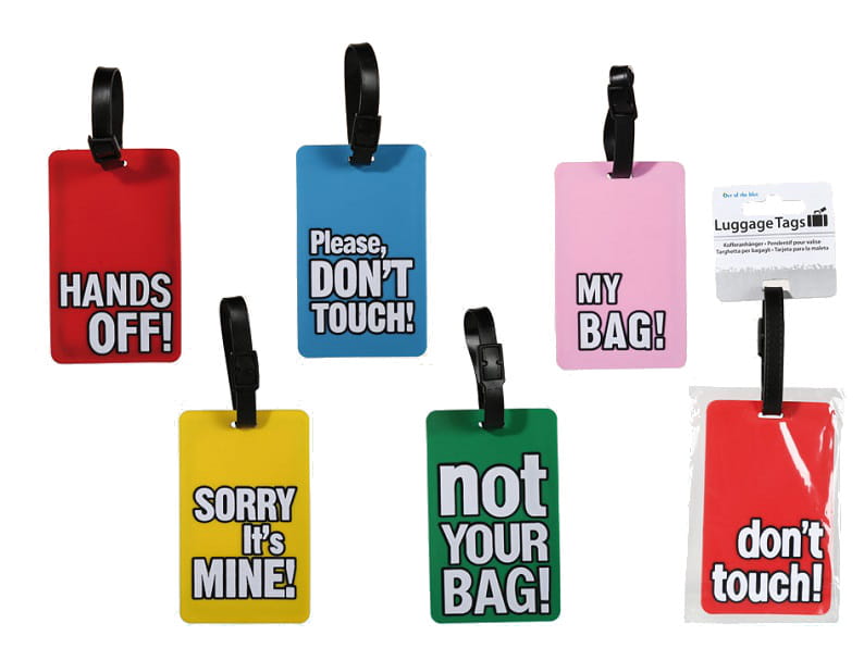 - po jednej stronie miejsce na umieszczenie danych właściciela, po drugiej zabawne slogany, aby obcy trzymali się od Twojego bagażu z daleka