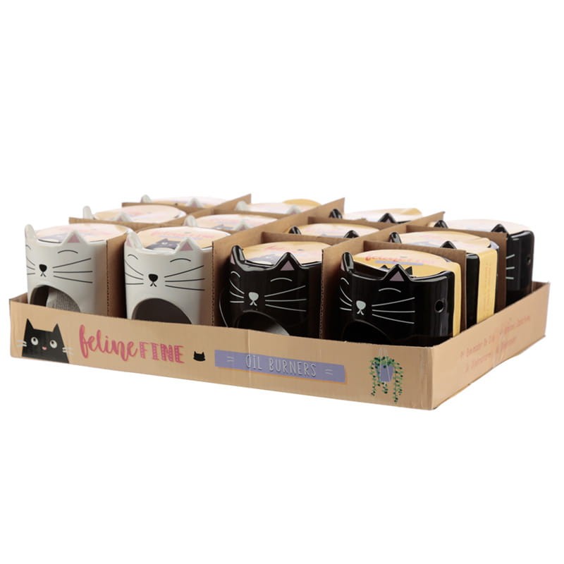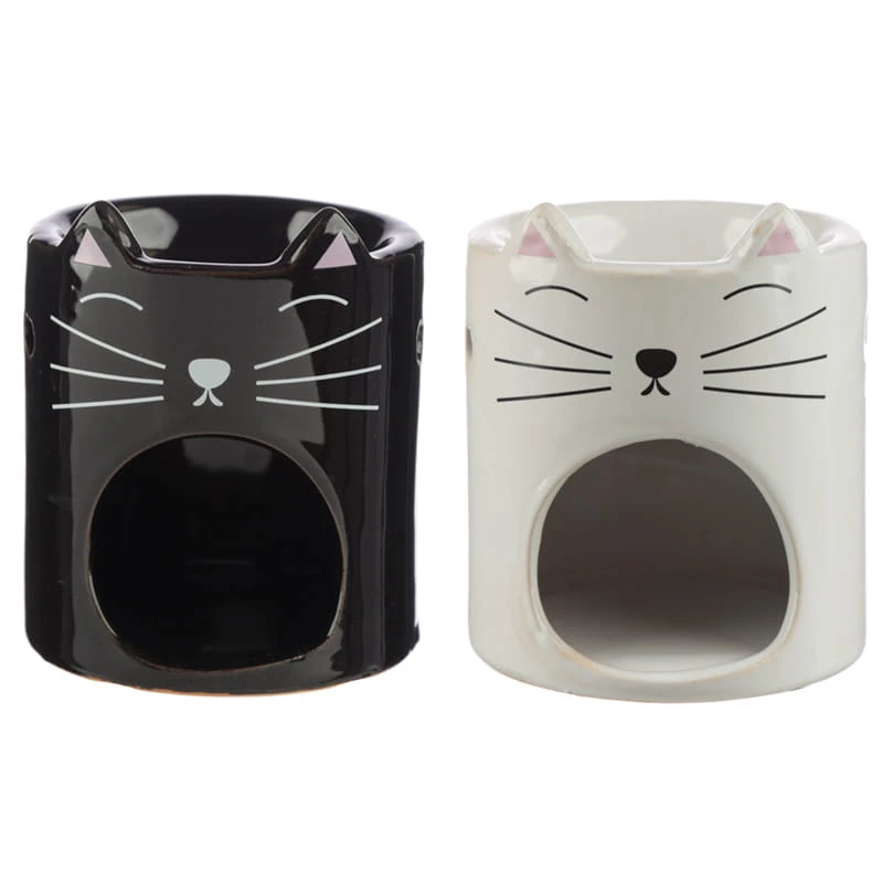 Ceramiczny kominek do olejków lub zapachowych kostek w kształcie głowy kotka. Kominek posiada na froncie wycięty ozdobny wzór na umieszczenie tealighta. Kominek nadaje się idealnie do domu, salonu SPA itp. Doskonały produkt na prezent dla kobiet lubiących urozmaicać domową atmosferę. Dostępny w dwóch kolorach: białym i czarnym. Wysyłamy jako mix wzorów.