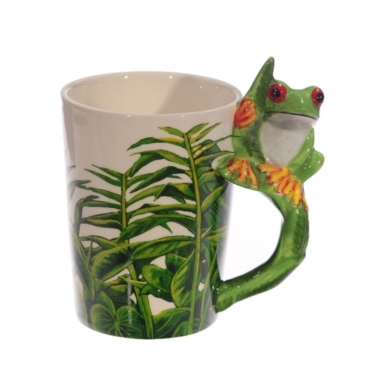 - wzór tropikalny, figurka żaby na krawędzi kubka