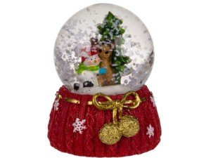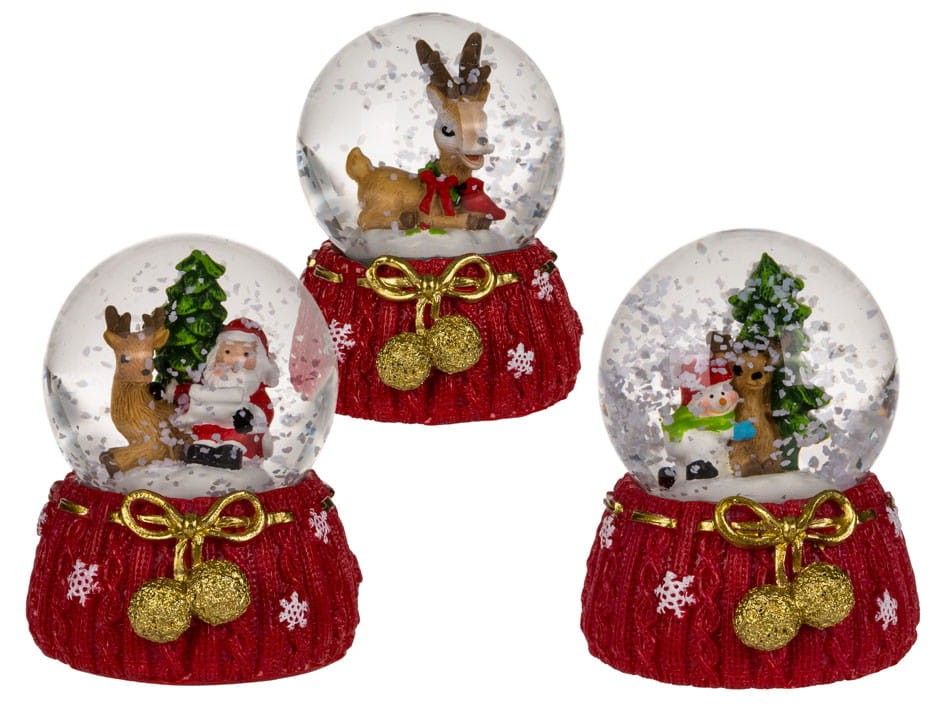 Klimatyczna i nastrojowa dekoracja świąteczna. Kula wypełniona płynem, w którym pływają płatki śniegu. Wewnątrz kuli znajduje się figurka Św. Mikołaja, renifera lub bałwanka. Każda w świątecznym klimacie. Podstawa kuli ozdobiona śnieżynkami i złotą kokardką i kulkami. Wspaniały upominek, dzięki któremu poczujemy magiczną atmosferę świąt. Sprzedawany jako mix wzorów. Display zawiera 12 kul.