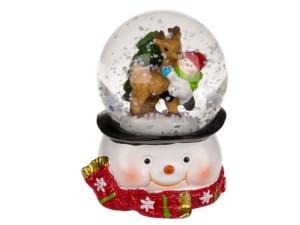 Klimatyczna i nastrojowa dekoracja świąteczna. Kula wypełniona płynem, w którym pływają płatki śniegu. Wewnątrz kuli znajduje się figurka Św. Mikołaja, renifera lub bałwanka. Każda w świątecznym klimacie. Podstawa kuli w kształcie głowy bałwanka. Sama kula stanowi kapelusz bałwanka. Wspaniały upominek, dzięki któremu poczujemy magiczną atmosferę świąt. Sprzedawany jako mix wzorów. Display zawiera 12 kul.
