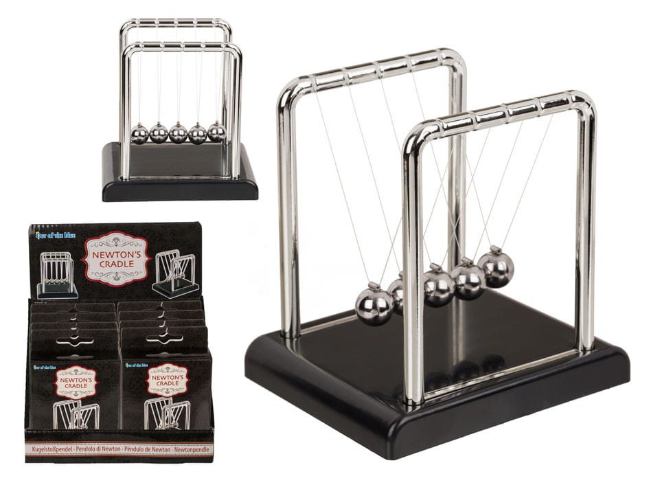 Na nitkach zawieszony jest rząd kilku stykających się ze sobą jednakowych stalowych kulek. Gdy jedna z nich zostanie odchylona i puszczona, jej uderzenie w pozostałe kulki spowoduje, że po przeciwnej stronie szeregu odskoczy tylko ostatnia kulka. Jej wychylenie będzie prawie takie samo jak pierwszej. Analogicznie, gdy podniesiemy i puścimy dwie kulki, z drugiego końca odskoczą również dwie kule. Ogólnie rzecz biorąc - tyle samo kulek odskoczy na końcu szeregu, ile odchylimy na jego początku, zaś pozostałe, środkowe kulki pozostaną nieruchome. Zachowanie to bywa postrzegane przez laików jako paradoks. Wysokość 9 cm.