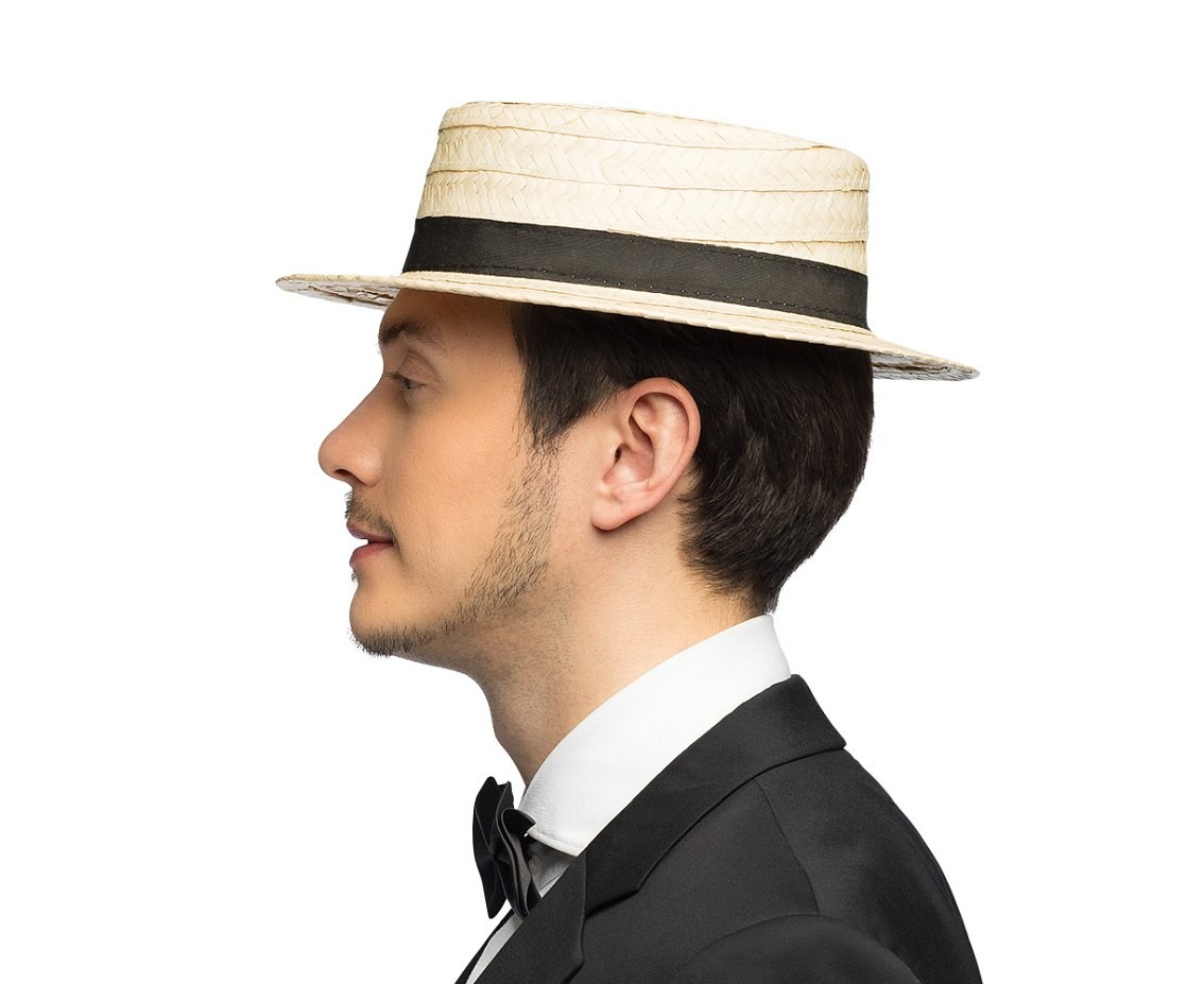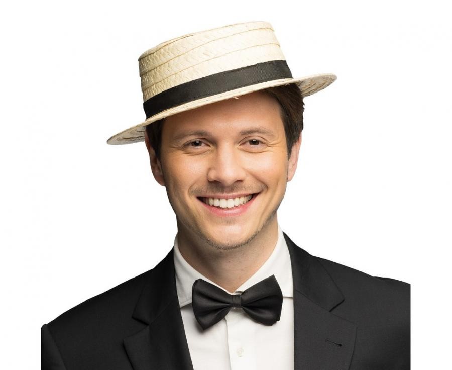 Wykonany z lekkiego materiału kapelusz charakteryzuje się naturalnym, słomkowym kolorem oraz ozdobą w postaci czarnej wstążki, która nadaje mu szyku i stylu. Doskonale komponuje się z garniturem, kamizelką czy smokingiem, podkreślając charakter stylizacji inspirowanej latami 20. i 30.