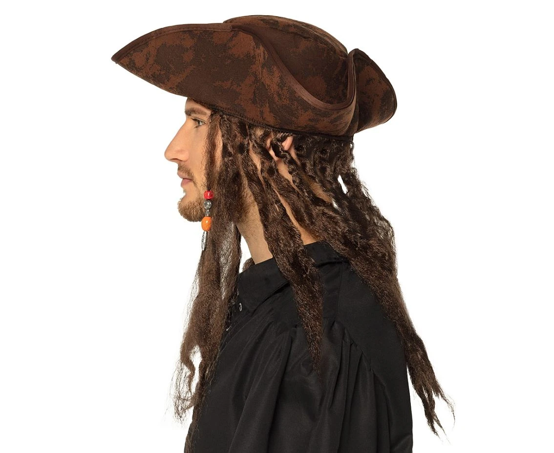 Wejdź na pokład jako nieustraszony pirat z kapeluszem Dirty Joe! Ten brązowy kapelusz w klasycznym trójkątnym fasonie został stylizowany na zniszczoną skórę i ozdobiony charakterystycznymi warkoczami oraz kolorowymi koralikami, które dodają autentycznego, dzikiego wyglądu.
