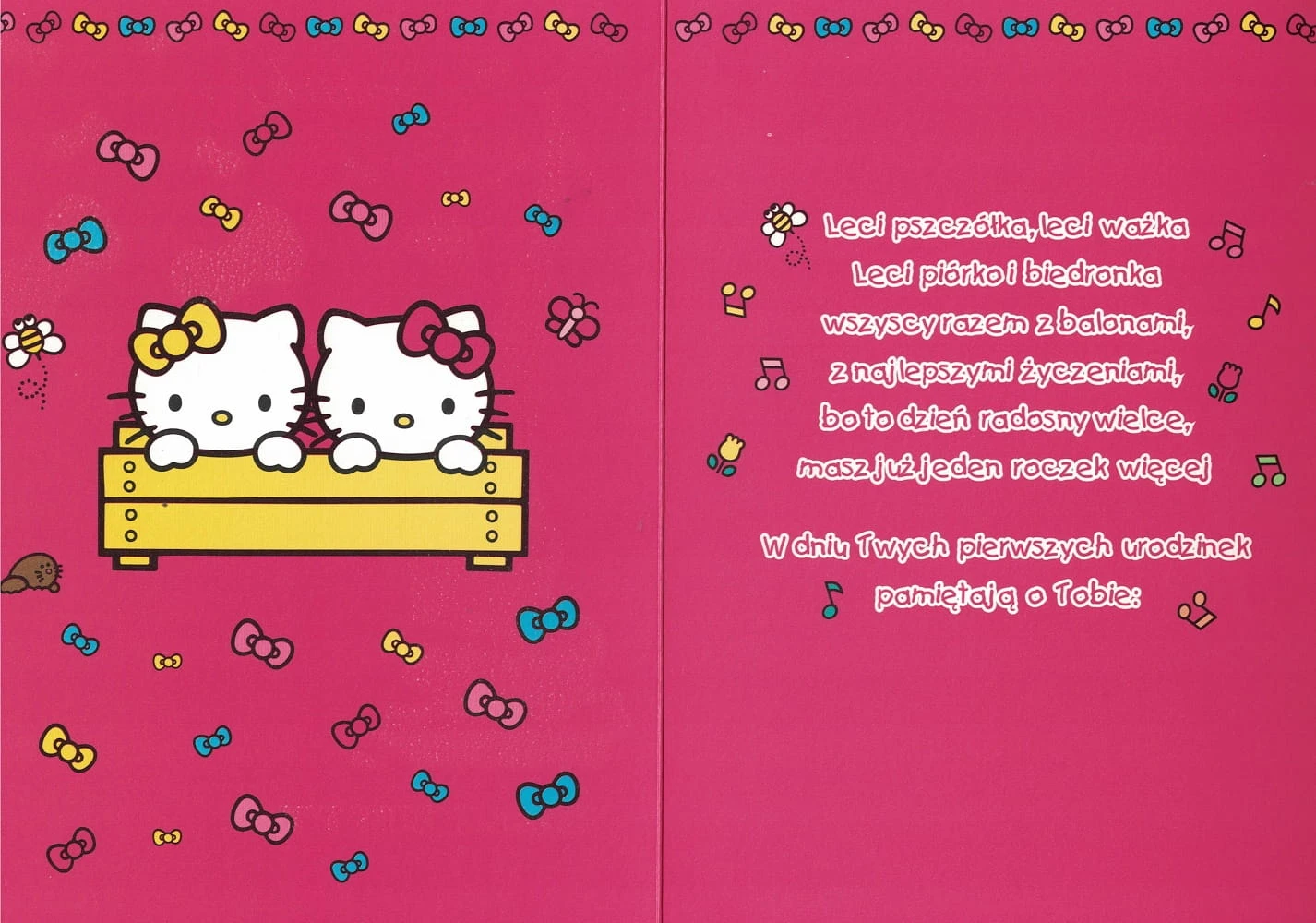 Duży kolorowy rozkładany karnet okolicznościowy z licencją Hello Kitty. Idealny do wręczenia przy ważnych okazjach. W skład zestawu wchodzi również koperta do zapakowania karnetu.
