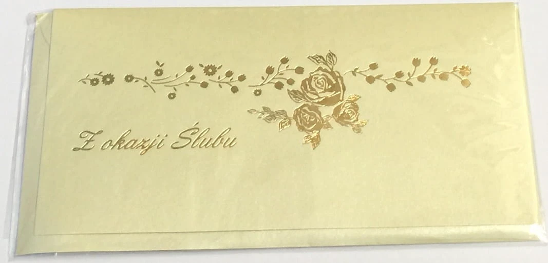 Karnet ślubny utrzymany w perłowo-złotej kolorystyce, bardzo elegancki. W zestawie znajduje się również złota koperta.
