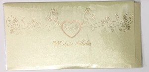 Karnet ślubny utrzymany w perłowo-złotej kolorystyce, bardzo elegancki. W zestawie znajduje się również złota koperta.