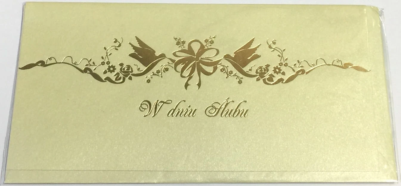 Karnet ślubny utrzymany w perłowo złotej kolorystyce, bardzo elegancki. W zestawie znajduje się również złota koperta.