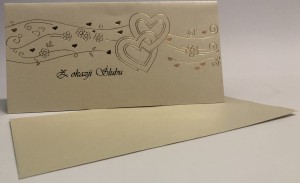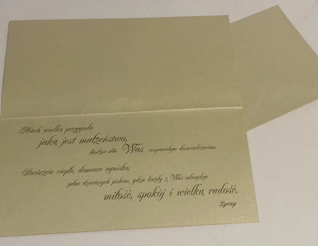 Karnet ślubny utrzymany w perłowo-złotej kolorystyce, bardzo elegancki. W zestawie znajduje się również złota koperta.