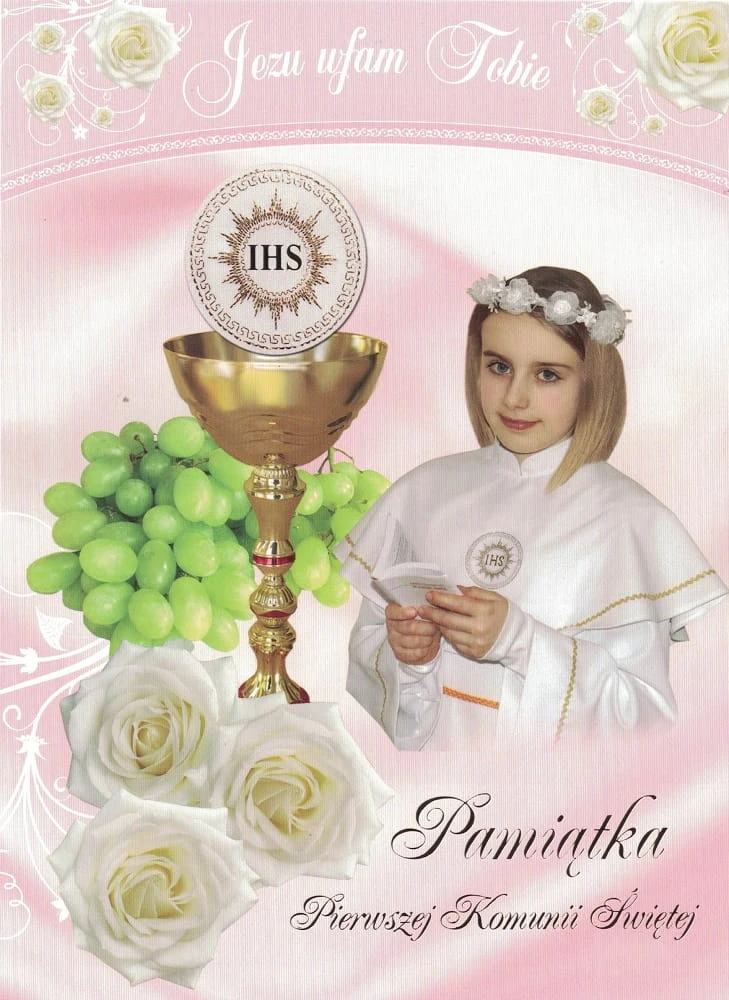 Duży kolorowy rozkładany karnet okolicznościowy. Idealny do wręczenia w dniu Komunii Świętej. W skład zestawu wchodzi również koperta do zapakowania karnetu.