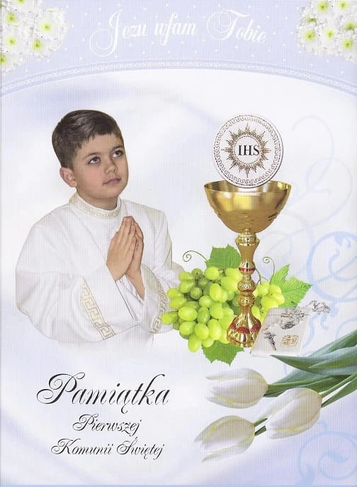 Duży kolorowy rozkładany karnet okolicznościowy. Idealny do wręczenia w dniu Komunii Świętej. W skład zestawu wchodzi również koperta do zapakowania karnetu.