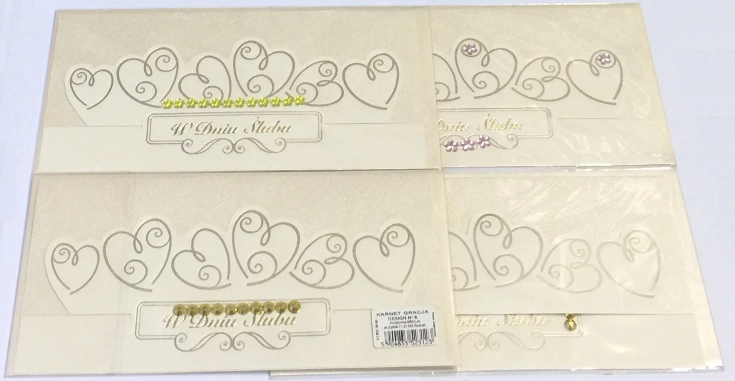 Karnet ślubny z piękną dekoracją z dodatkowymi kamieniami. Karnet utrzymany w perłowo-złotej kolorystyce, bardzo elegancki. W zestawie elegancka koperta. Wysyłamy jako mix wzorów.