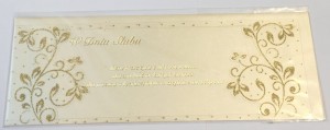 Karnet ślubny z piękną dekoracją. Karnet utrzymany w perłowo złotej kolorystyce, bardzo elegancki. W zestawie znajduje się koperta.
