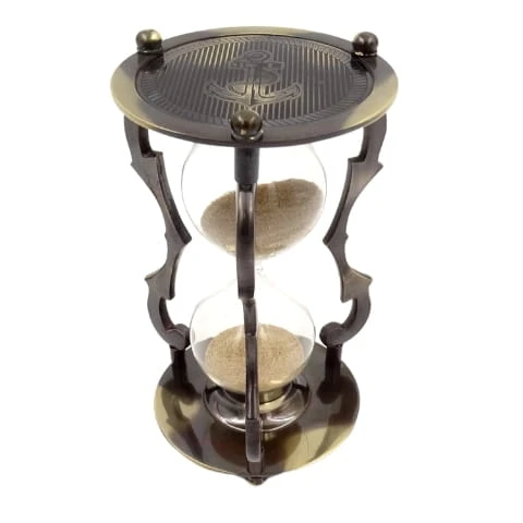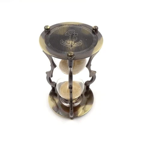 Klepsydra wykonana jest z mosiądzu. Szklane bańki wypełnione są beżowym piaskiem. Obydwie podstawy połączone zostały za pomocą oryginalnych, ozdobnych nóżek. Na topie jednej z podstaw znajduje się kotwica. Czas przesypywania piasku to około 5 minut