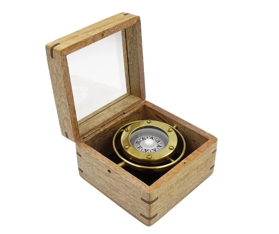 Kompas przechyłowy to kompas, który poziomuje się sam przy przechyleniach statku. Tego typu busole używane były w żegludze, gdyż niezależnie od odchyleń łodzi wskazywały odpowiednie kierunki. Kompas przechyłowy Gimble sprawdzi się jako nautyczna dekoracja do kajuty lub nadmorskiego hotelu. Będzie się dobrze prezentować na kapitańskim biurku. Kompas przechyłowy sprawdzi się jako prezent dla sternika, miłośnika żeglugi i kapitana statku. Obudowa kompasu wykonana jest z mosiądzu. Konstrukcja przytwierdzona została do drewnianego pudełka ze szklanym topem. Czytelna róża wiatrów gwarantuje łatwy odczyt nawigacyjnych danych.
