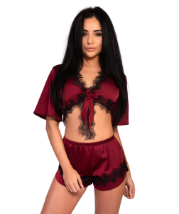 Przedstawiamy elegancki i wyjątkowo kobiecy komplet bielizny, który składa się z koszulki zawiązywanej z przodu oraz spodenek. Ten wyjątkowy zestaw został wykonany z materiału o delikatnej satynowej fakturze, który składa się z 92% poliestru oraz 8% elastenu, co zapewnia komfort noszenia i odpowiednią elastyczność dla idealnego dopasowania do sylwetki.