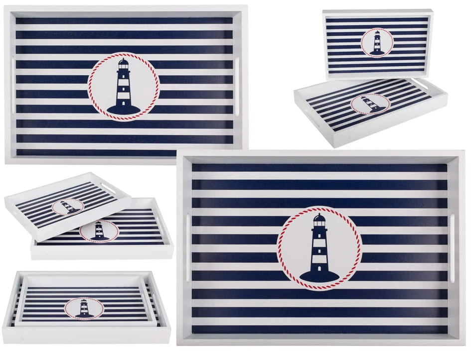 Wygodne i bardzo trwałe drewniane tace z rączkami, w marynistycznym klimacie. Ciekawy wzór i solidne wykonanie, sprawią, ze tace długo będą służyć nam w kuchni i będą cieszyć oko swoim wyglądem. Świetnie się sprawdzą przy przenoszeniu napojów czy posiłków z domu do ogrodu lub w restauracji. Sprzedajemy komplet - czyli dwie tace.