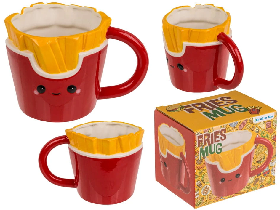 Uśmiechnięte frytki na kubku przyciągają wzrok i wywołują pozytywne emocje, niezależnie od wieku. Kubek świetnie sprawdzi się jako prezent – zapakowany jest w estetyczne, kolorowe pudełko, gotowe do wręczenia bez dodatkowego pakowania.