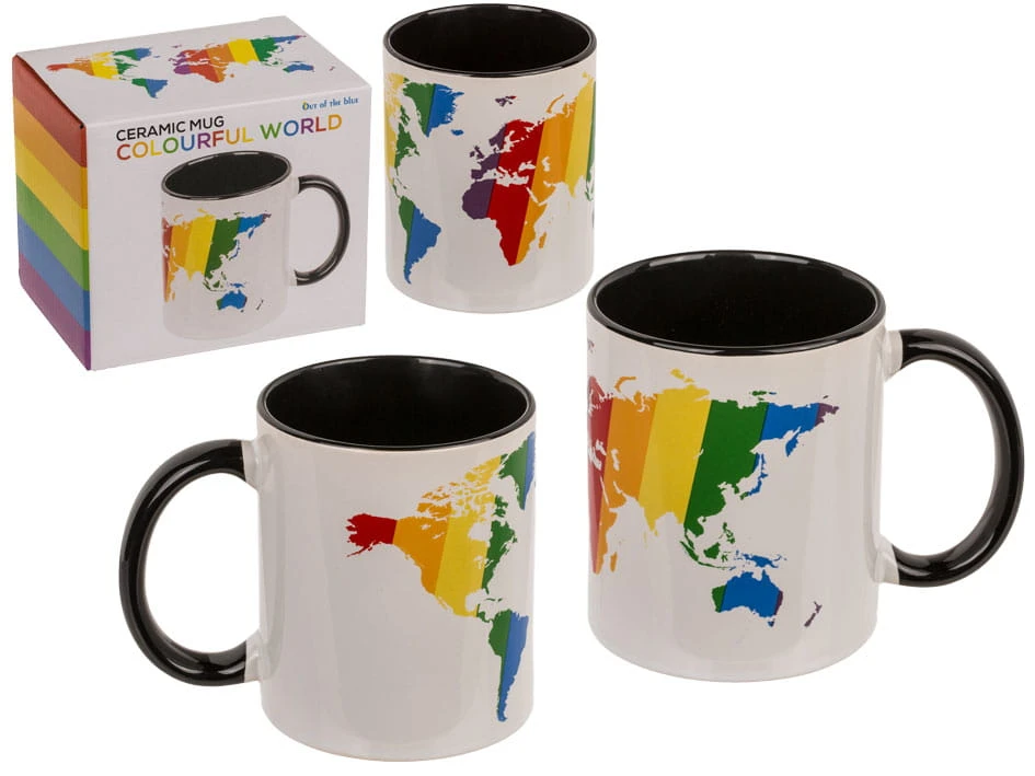 - Kubek z mapą świata w barwach tęczy, celebrujący różnorodność i akceptację