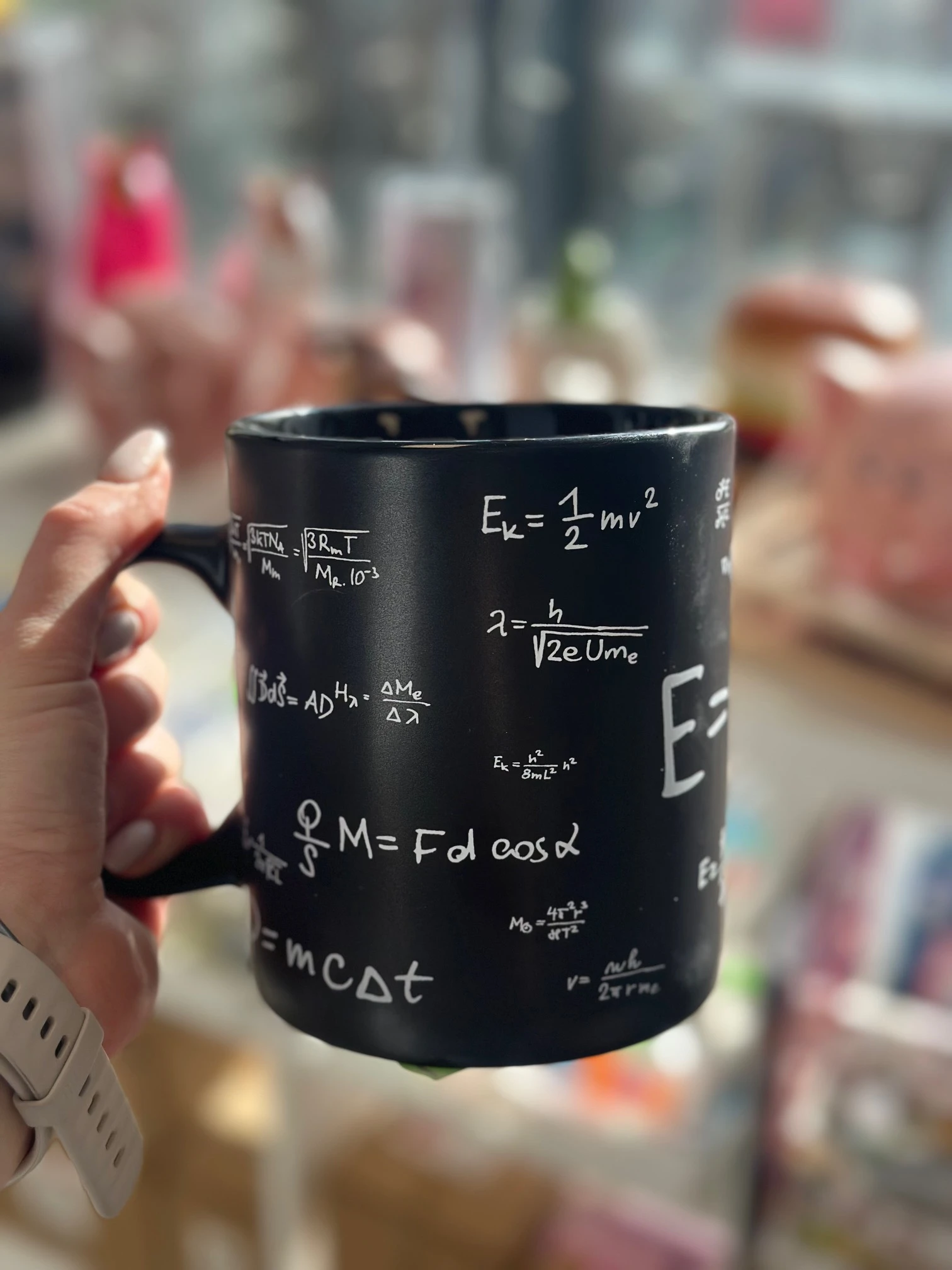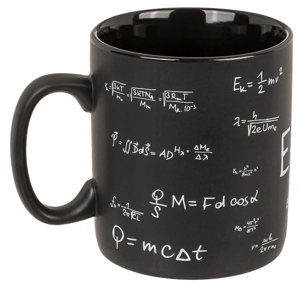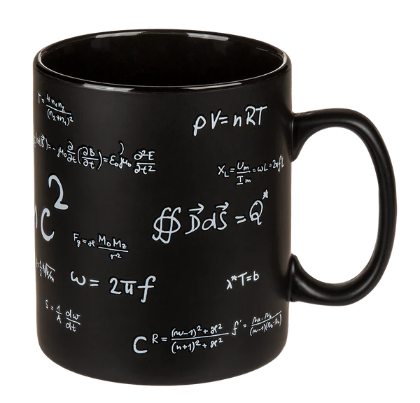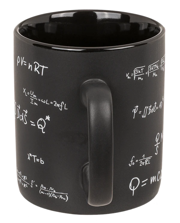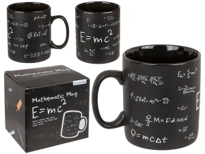 Ten czarny kamionkowy kubek XXL to doskonałe połączenie funkcjonalności, designu i humoru. Kubek ozdobiony jest wzorami matematycznymi, w tym klasycznym E=mc², dzięki czemu idealnie wpasuje się w przestrzeń biurka, pokoju studenta lub domowego gabinetu.