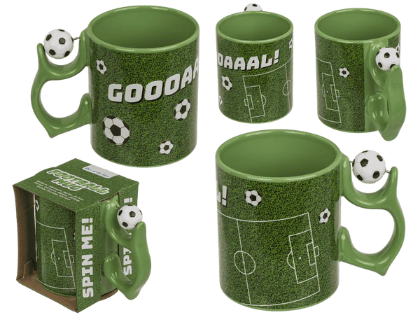 Kubek piłkarski GOOOAL! z obrotową piłką w uchwycie. Idealny dla kibica, do pracy i na prezent. Antystresowy gadżet dla fanów futbolu.