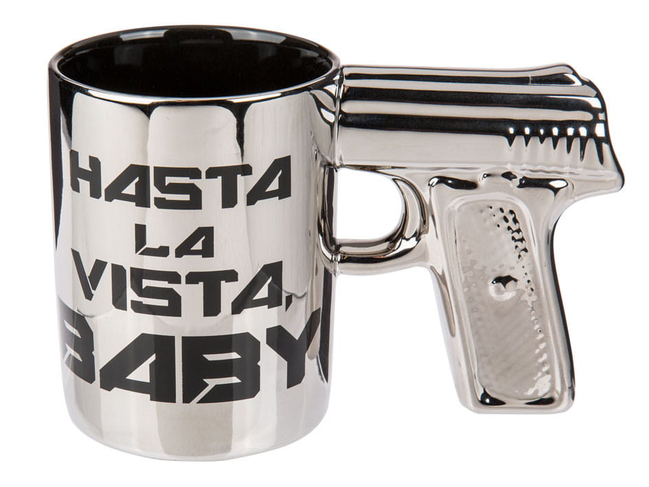 Jeśli czasami z rana masz ochotę rozstrzelać wszystkich znajdujących się w zasięgu Twojego wzroku lub jeśli po prostu jesteś super twardzielem. Poczuj tą zimną rękojeść w trakcie picia porannej kawy. Kubek w wersji LUX - pokryty cały srebrną metaliczną farbą, aby lepiej odwzorować broń. Dodatkowo na kubku znajduje się jeden z najbardziej kultowych tekstów jakie można wypowiedzieć trzymając spluwę "Hasta La Vista Baby". Bezpieczny w użyciu zarówno dla użytkownika, jak i otoczenia.