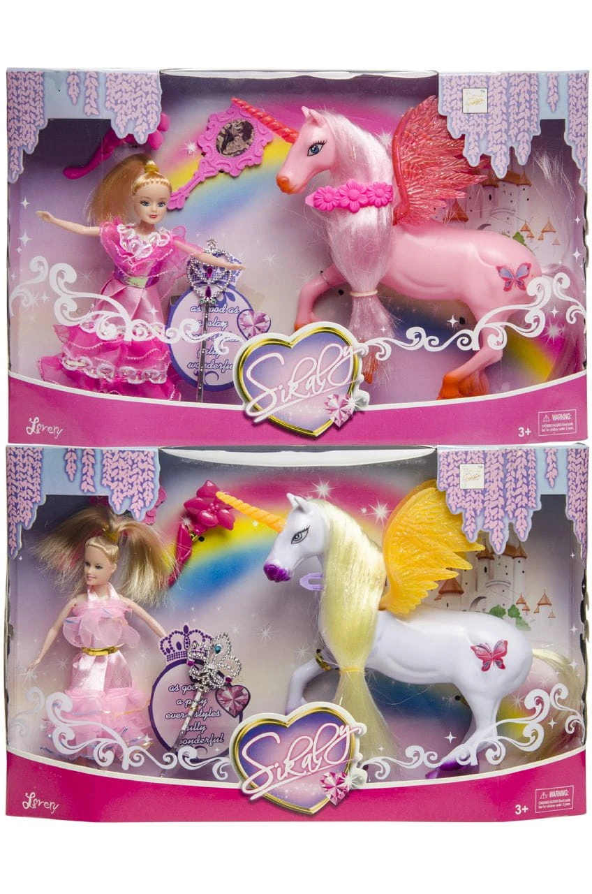 Oto uroczy zestaw dla dzieci: lalka księżniczka z towarzyszącym jednorożcem, zapakowany w piękne pudełko prezentowe.