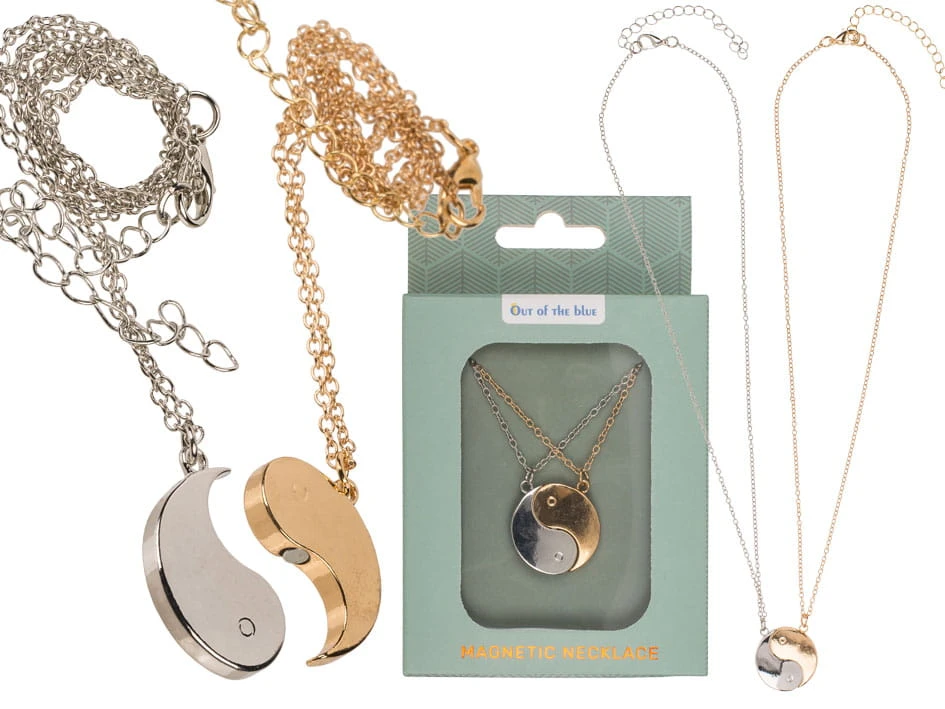 Magnetyczny składany naszyjnik , którym dwie połówki Ying & Yang łączą się w całość. Ying i Yang są współzależne. Jedno nie może istnieć bez drugiego. W opakowaniu znajdują się dwa łańcuszki , każdy z połówką znaku, można nosić jako jeden łańcuszek lub rozdzielić na dwa. Prezent dla przyjaciół , par, zakochanych. Zapakowany w kartonik prezentowy z okienkiem.