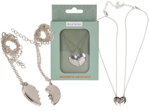 Magnetyczny składany naszyjnik , którym dwie połówki serca łączą się w całość. W opakowaniu znajdują się dwa łańcuszki , każdy z połówką serca. Prezent dla przyjaciół , par, zakochanych. Zapakowany w kartonik prezentowy z okienkiem.