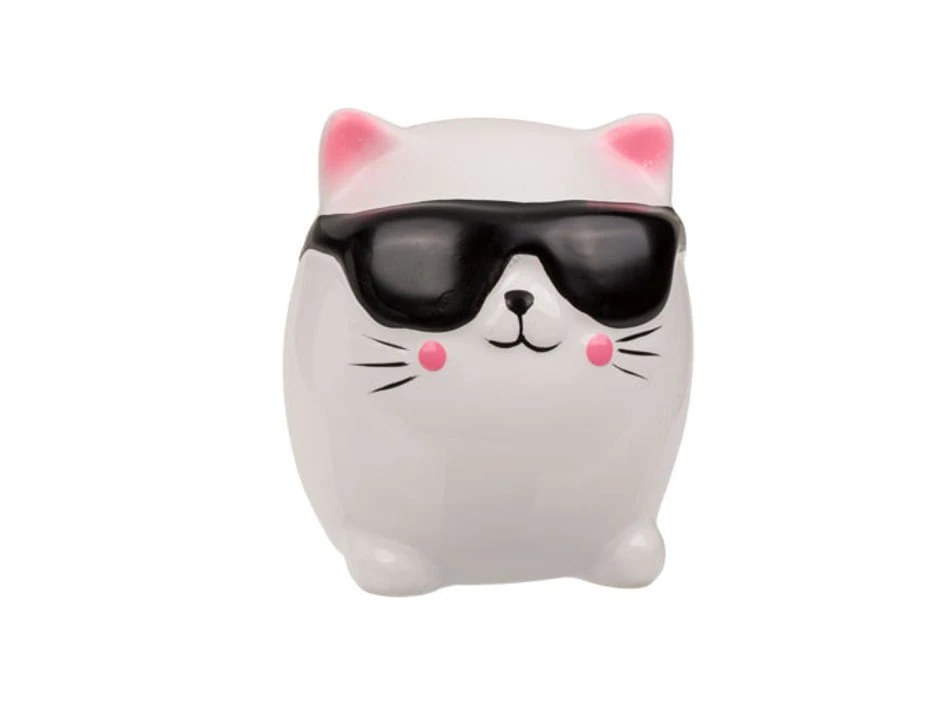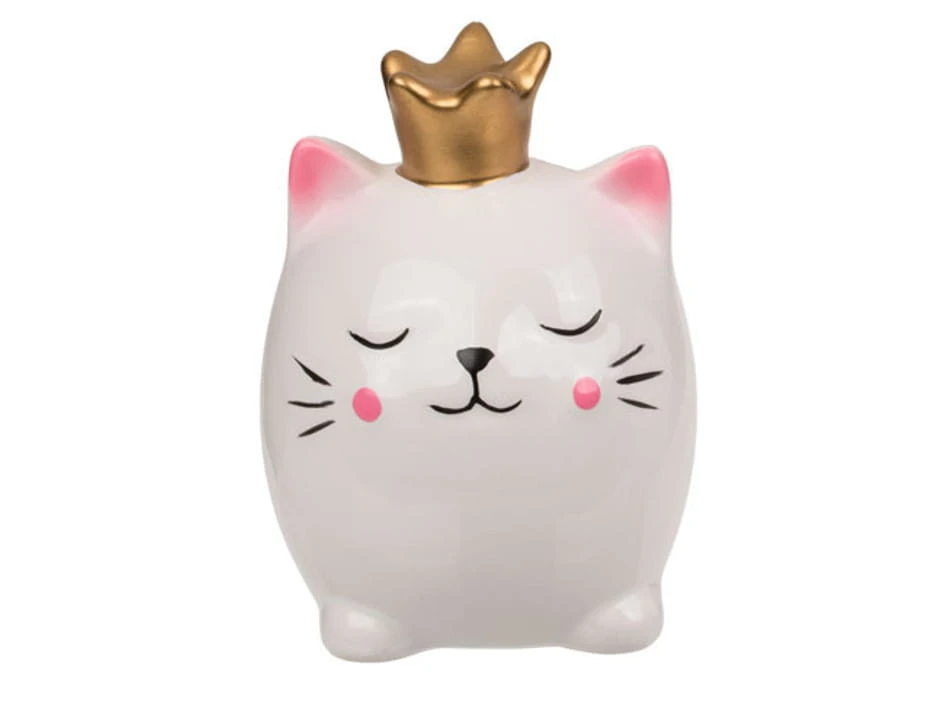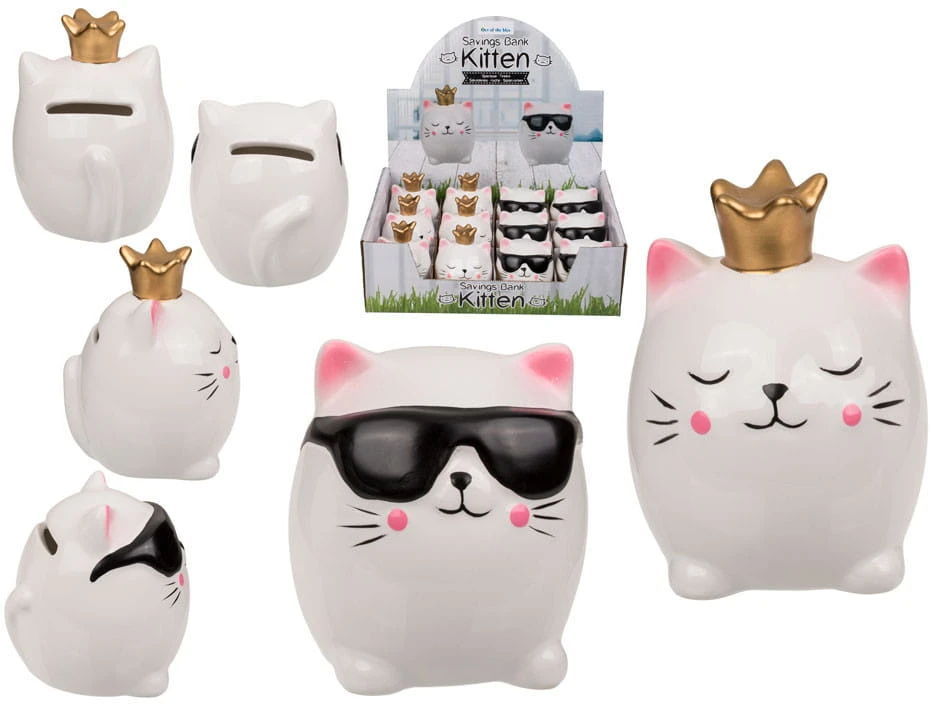 Ceramiczna skarbonka w postaci pięknego białego kotka w czarnych okularach lub ze złotą koroną. Idealna skarbonka dla dzieci kochających te zwierzęta. Skarbonka z zatyczką na spodzie. Idealny produkt na prezent. Dostępne są dwa wzory graficzne, sprzedajemy jako mix.