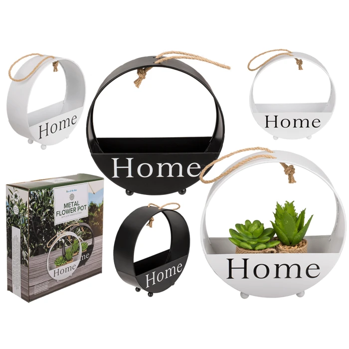 Metalowa doniczka ścienna z napisem Home to niebanalna dekoracja, która z pewnością ożywi wystrój i zwróci każdego uwagę. Wiszące doniczki świetnie wyglądać będą w każdym pomieszczeniu i dadzą możliwość stałego kontaktu z zielenią. Okrągła doniczka idealnie sprawdzi się na wszelkiego rodzaju rośliny, a przede wszystkim rośliny pnącze z rodziny bluszczowatych. Doniczka wykonana jest z metalu. Dostępna w 2 kolorach - czarna i biała. Wysyłamy jako mix.