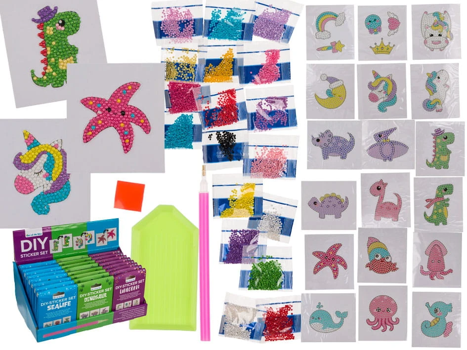 Naklejki zrób to sam to zestaw 12 naklejek, które pozwolą na stworzenie własnych wzorów. Każda naklejka składa się z obrazka, który można udekorować koralikami. Naklejki są łatwe w użyciu i pozwalają na kreatywną zabawę.