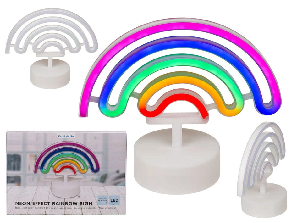 Zasilana na baterie, neonowa, dekoracyjna lampa w kształcie wielobarwnej tęczy. Świetny gadżet dekoracyjny. Dzięki zasilaniu na baterie można ją postawić w dowolnym miejscu. Efektowna ozdoba salonu, sypialni, pokoju dziecięcego. Zapakowana w kartonowe pudełko.