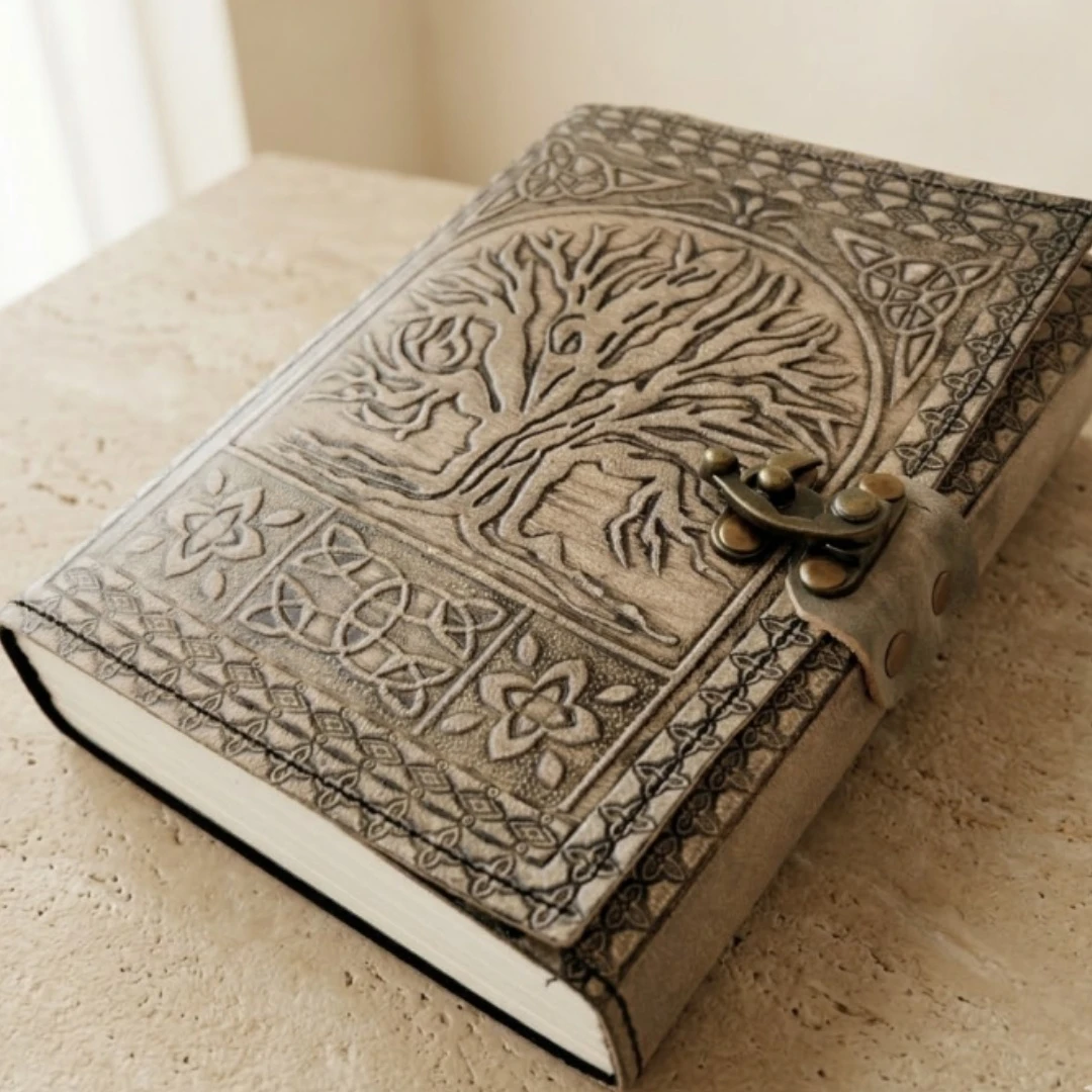 Niektóre przedmioty nie służą tylko do zapisywania informacji – one służą do przechowywania historii. Ten unikalny notatnik retro wygląda jak cenna kronika, przekazywana z pokolenia na pokolenie. Okładka z grubej, naturalnej skóry bawolej ozdobiona została głębokim tłoczeniem Drzewa Życia, które symbolizuje siłę, rozwój i harmonię z naturą. To przedmiot, który natychmiast przyciąga wzrok i budzi ciekawość każdego, kto ceni autentyczność i rzemieślniczy kunszt.